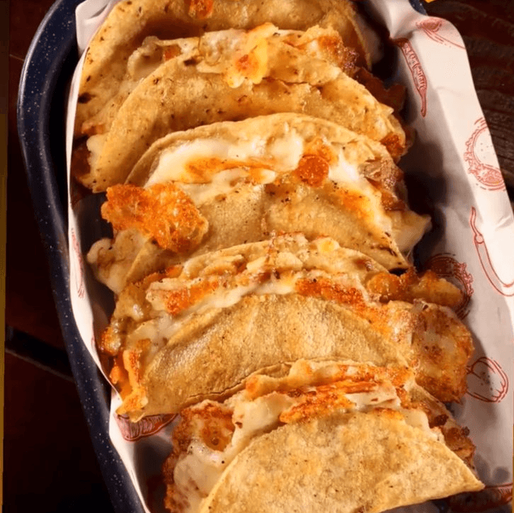 Tacos con queso enchilados con la tradiciónal barbacoa crujiente con su cebolla asada.